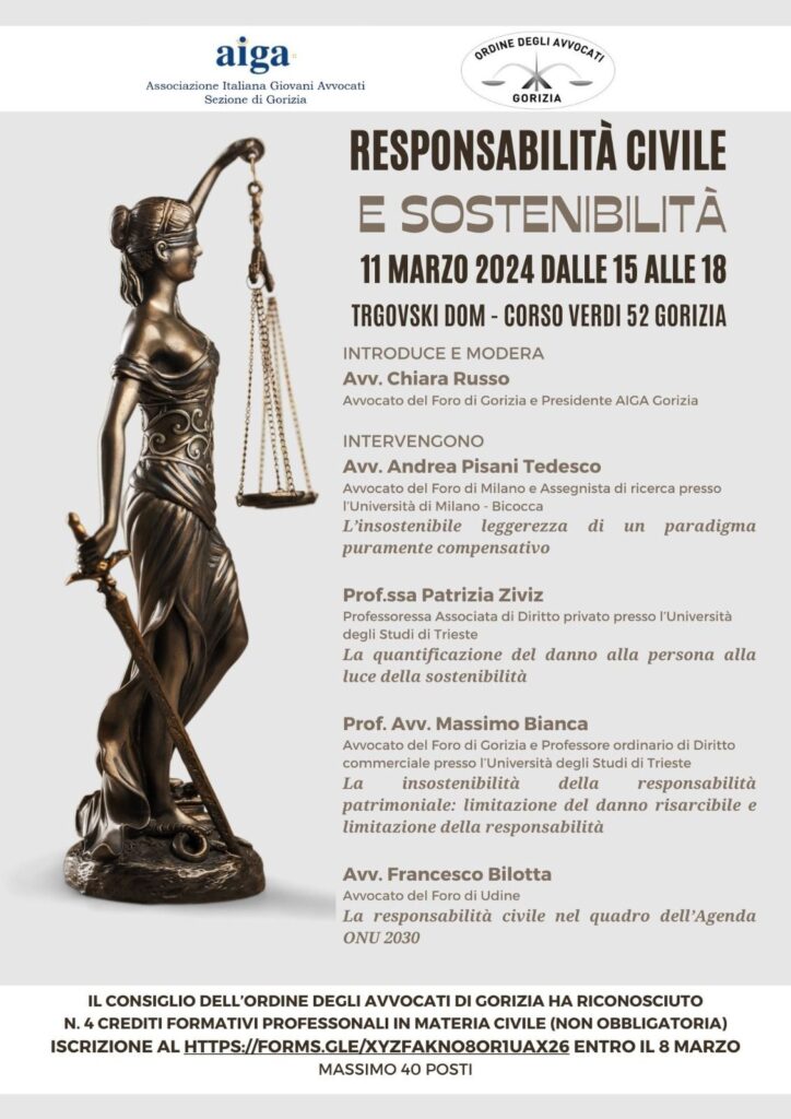 Sembra impossibile associare i concetti di responsabilità civile e di sostenibilità: noi lo faremo! Evento organizzato da AIGA Gorizia, con la partecipazione dell’Avv. Chiara Russo.
